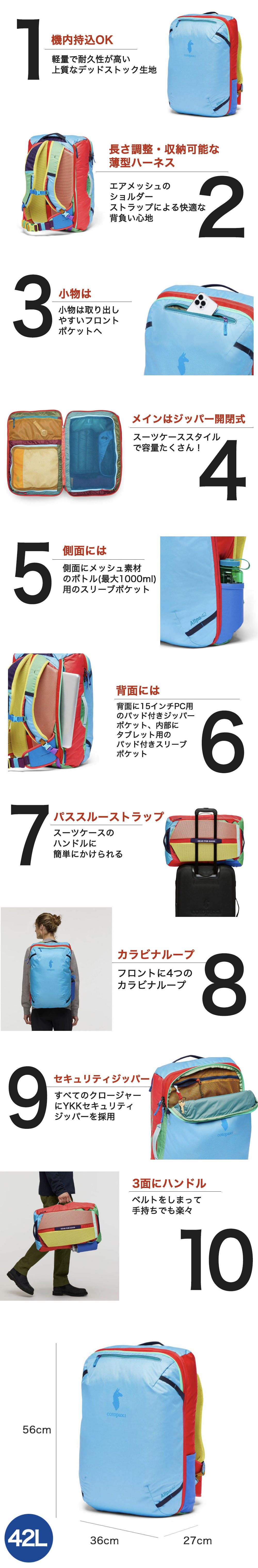 ・ブランド:コトパクシ(Cotopaxi) ・サイズ:56x36x27cm [ハーネス]50-94cm[トップハンドル]13cm[ウェストベルト] 40-127cm ・容量:42L ・重量:1200g ・素材:ナイロン、ポリエステル ※内側やサイドなど写っていない部分も全て異なりますので、お届けまでお楽しみに! ※写真の色味は実際のものと若干異なる場合がございます。予めご了承ください。 |