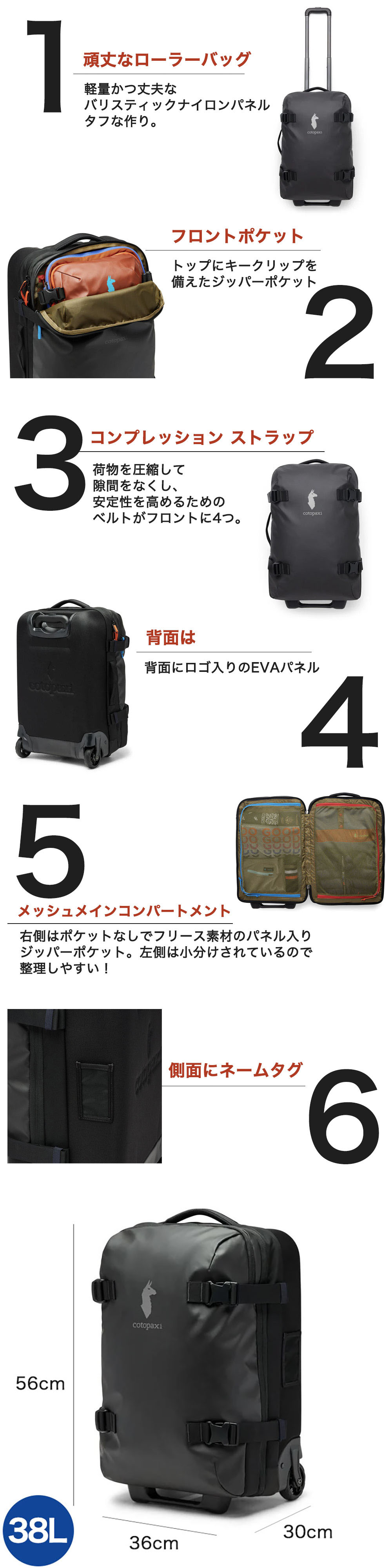 ・ブランド:コトパクシ(Cotopaxi) ・サイズ:56×36×30cm ・容量:38L ・重量:2,790g ・素材:ナイロン、ポリエステル |
