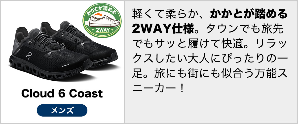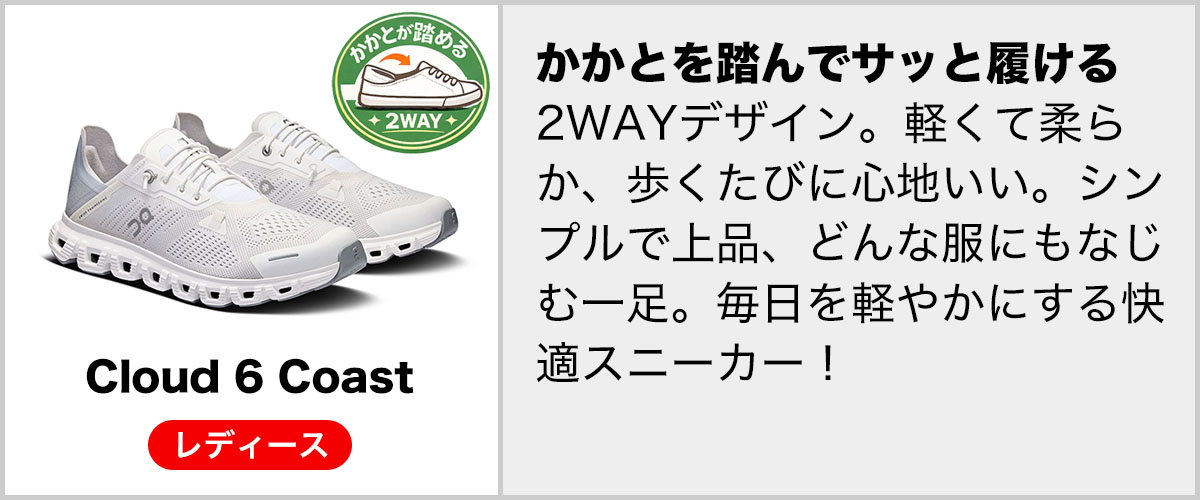 一度履いたら、もう手放せない On(オン)の圧倒的な履き心地 On のスニーカーは、雲の上を歩くような軽やかさとクッション性が特徴です。CloudTec テクノロジーが着地の衝撃を吸収し、足元を優しくサポート。驚くほどの軽さで、足に余計な負担をかけることなく快適な歩行を実現します。 長時間履いても疲れにくいため、ランニングやウォーキングはもちろん、日常の移動や旅行にも最適。ぜひ On の履き心地を体感してみてください。 ![]() On(オン)が男女問わずおすすめな理由 ユニセックスな洗練デザイン シンプルでミニマルなデザインなので、どんなファッションにもマッチ。カジュアルからビジネスカジュアルまで、幅広いスタイルにフィットします。 軽くて快適、どんなシーンにも対応 驚くほどの軽さとクッション性を備えており、長時間の歩行や通勤・通学、旅行にも最適。運動だけでなく、普段履きとしてもその快適さを実感できます。 豊富なサイズ展開 メンズ・レディースともに幅広いサイズが揃っており、自分にぴったりのフィット感を見つけることができます。 ペアコーデにもおすすめ 男女で同じデザインのシューズを選べるので、カップルや夫婦でお揃いコーデを楽しむのにもぴったりです。 プロも認める高機能 世界中のアスリートから愛される On の機能性は、性別を問わず誰にとっても最高の履き心地を提供します。 「ラクなのに、おしゃれ」を求めるすべての人におすすめ!あなたも On の快適さを体感してみませんか? ![]()