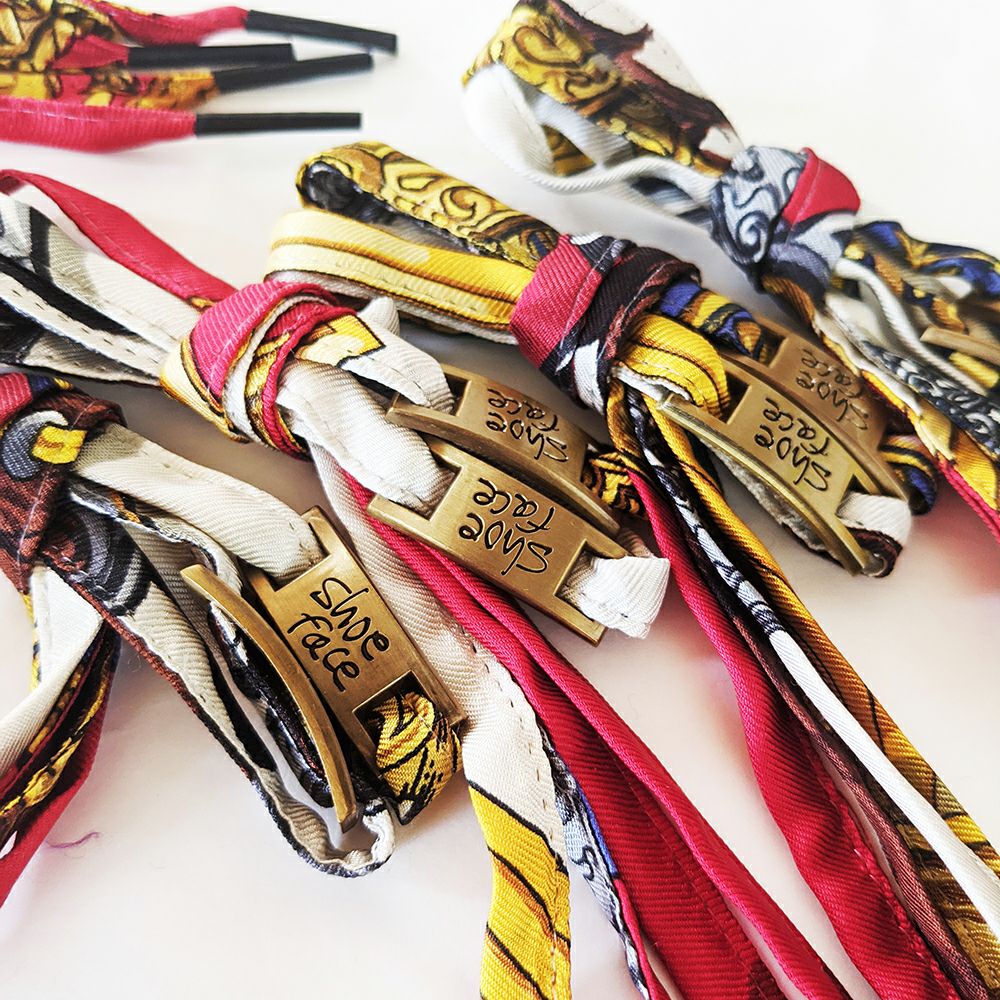 スカーフとして使えそうにないダメージなどがあるものが多くあり、そういうスカーフたちは靴紐としてまったく新しい価値をもって生まれ変わります。そのままでスカーフとして使用可能なものも勿論ありますが、そういったものが靴紐になったときの、本来とはまた違った新しい魅力も本当に素晴らしいです。