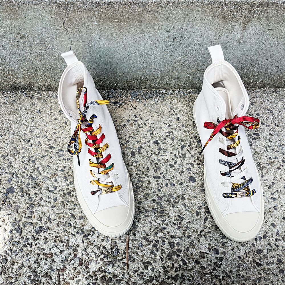 そんな時、インスタ内でたまたま見つけたshoe faceのスカーフシューレース。スカーフから作られた靴紐?これは見たことない!色鮮やかで上品な柄、スカーフならではの艶やかな質感。写真を見ているだけで楽しくなります。すぐに、気に入った靴紐を購入。今まで敬遠していた白スニーカーを購入して、靴紐が届くのを待っていました。