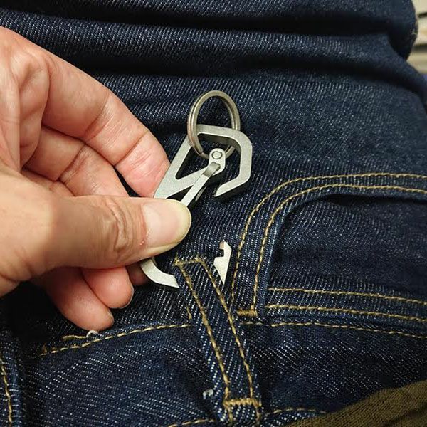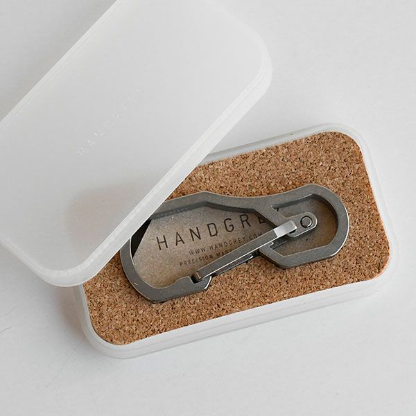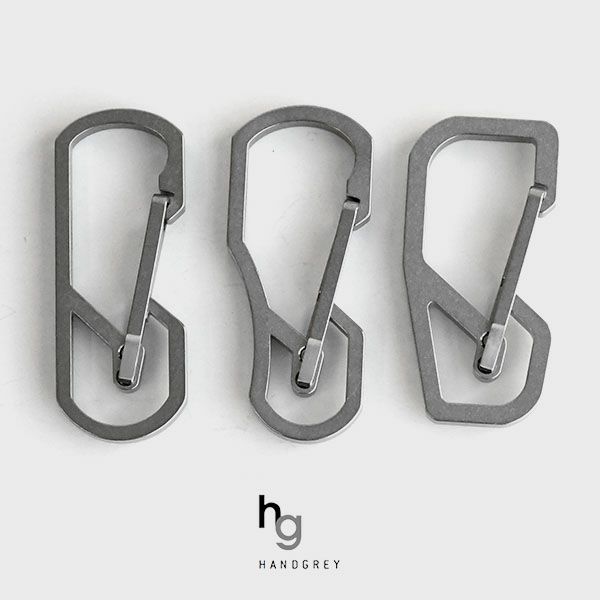 ハンドグレイのカラビナは、放電加工製法により1枚のチタンから作られています。ネジやヒンジの無いワンピース構造で、ミニマルなデザインを実現。