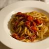 アンチョビの姿がなくなったら、小さく切ったミニトマト(1カップ)を入れ、トマトが柔らかくなるまで弱火で煮込みます。パスタの茹で汁を少し入れ、乳化させます。これをパスタと和えて完成です。お好みでイタリアンパセリのみじん切りをのせても。仕上げにオリーブオイルをたっぷりと。