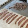 ニンニク1片と、下処理した塩漬けアンチョビ8枚をすり鉢で磨り潰します(すり鉢がない場合には、ごく細かいみじん切り)。白ワインビネガー大さじ1とエキストラバージンオリーブオイル適量を加えてよく混ぜ、乳化させます。