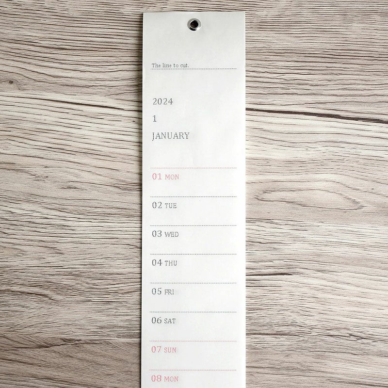 スリム仕様で何所でもOK!! 長~い業務用のレシートを《85cm》にカットした12枚綴りのカレンダー。 長さ85cmのロングサイズながら横幅7.5cmの省スペース設計で、柱や家具の脇など、僅かな隙間でも楽々設置!!上部に曲がり防止の厚紙と12ヶ月分のシートがまとめてスチールパーツで固定。重量僅か48gと壁の負担もかなり控えめ。直径6mmの穴が用意され、画鋲で留めたりフックに掛けたりと様々な環境にしっかり対応。月が経過する毎に上部の The line to cut _ _ _ _ _ _ _ _ _ _ _ _ _ _ _ の部分でカットして新しい月に。何故か心も心機一転!? 癒し系?"ノスタルジックな味わい"が魅力!! 1年365日のデータをプログラミングして、業務用のプリンターで延々と打ち続けた力技の一品。 20世紀のロボットを彷彿とさせるガタガタ書体は、最小限のドットで表した姿。綺麗なフォントに見慣れた私達にはむしろ新鮮。周回遅れ"トップ"のかっこよさ? 日本の暦に合わせて平日は《黒》、休日は《赤》でプリント、お休みやスケジュールが一目瞭然!!サラサラの紙だから鉛筆やボールペンなど、手軽&スムースに記入出来てストレスなし!!自宅だけでなく、業務用としても実用的。 よ~く見ると、印字には濃い部分や薄い部分がムラとなってかなり微笑ましい。紙の柔らかな白さと相まってかなり素敵です。(サイド部に用紙切れを知らせる赤いラインが入る場合があります) no quiet/ノークワイエットとは? デザイナー/干場 邦一(ほしばくにかず)氏による新進気鋭のブランド。 研ぎ澄まされたコンセプトと柔軟性を持ち合わせる、他には無いフィロソフィーを持つ不思議なブランドです。 『made in Japan』を重視、日本の職人/工場に支えられてデザインを具現化、惜しみない手間をかけて完成する共同制作的体制で物作りをしているだけに、ジャパンメイドの良さを世界に示していきたいと願っているそうです。