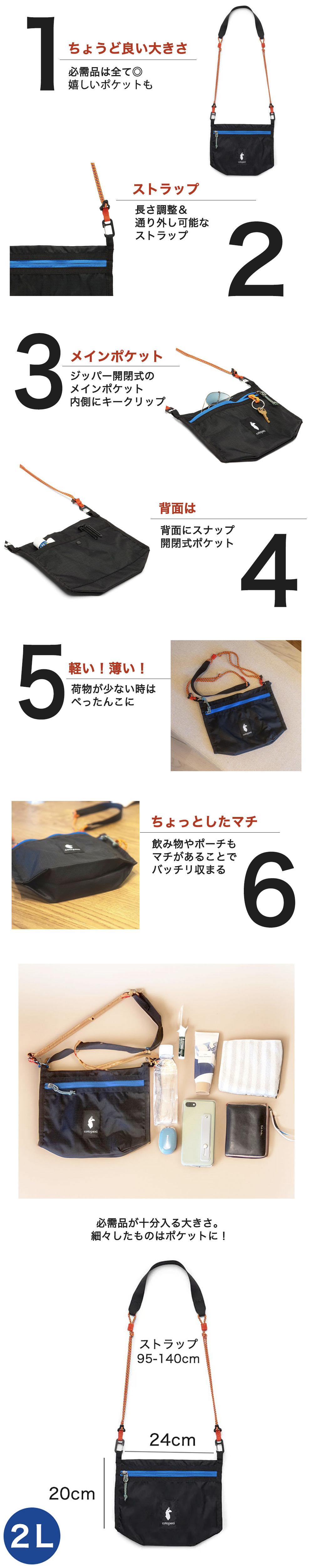 【メール便はギフト対象外となります】 ・ブランド:コトパクシ(Cotopaxi) ・サイズ:24×20×7cm [ストラップ/ワンショルダーベルト]95-140cm ・重量:80g ・容量:2L ・素材:ナイロン、ポリエステル |