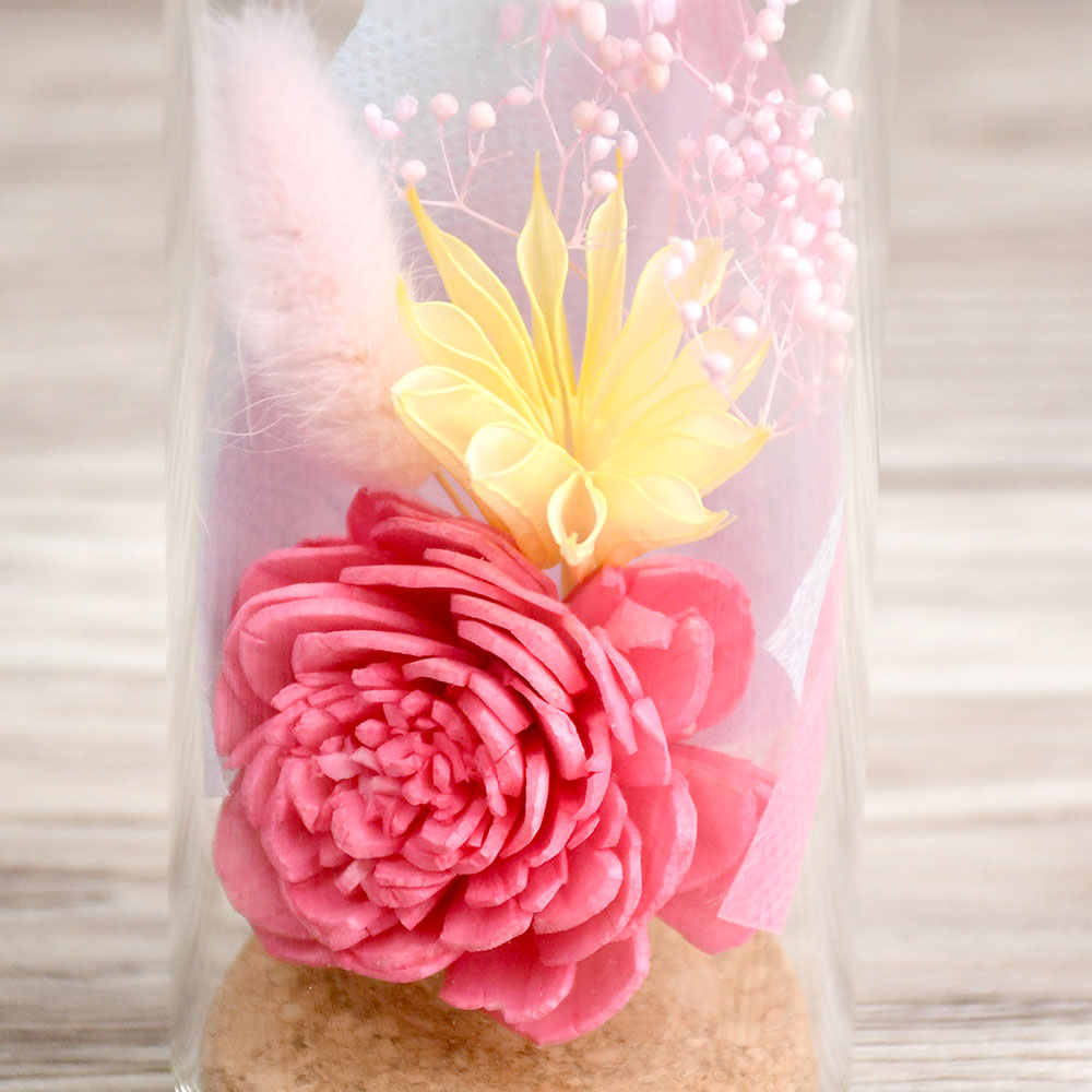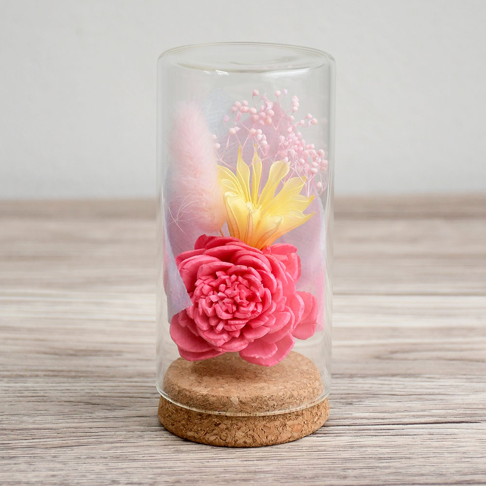 手のひらサイズのコルク瓶の中に、ドライフラワーの小さな花束が入っています。