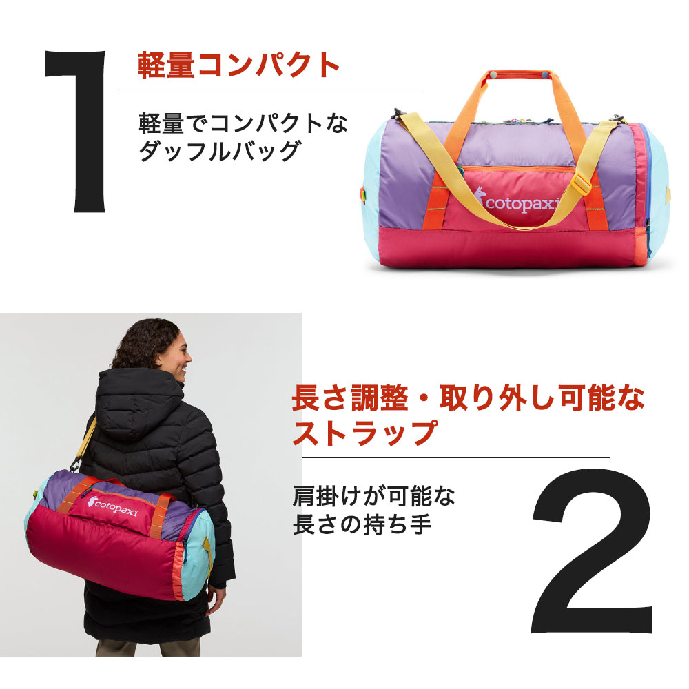 ・ブランド:コトパクシ(Cotopaxi) ・サイズ:64x33x33cm トップハンドル:66cm ストラップ/ワンショルダーベルト:83-145cm ・容量:45L ・重量:480g ・素材:ナイロン、ポリエステル |
