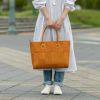 横型は縦型よりマチが2cm薄いので肩掛けもしやすく、開口部が広いためファイルやPCなど、横向きで持ち運びたいアイテムが出し入れしやすいつくりです。底板は取り外し可能で、重い荷物も支えて形崩れを防ぎます。開口部の天マチはジッパー付きで安心です。背面上部の外ポケットは、定期やスマホを入れておくのに便利。